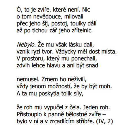 Klavírista měl krásný hudební nápad a já si vzpomněla na jeden Rilkův sonet o tvůrčí síle, jež umí vdechnout život jednorožci. Sonet bylo pro účely písně nutné poněkud dekonstruovat, ale výsledek se mi líbí.